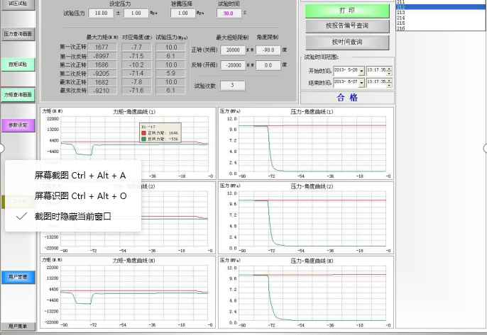 3、在進行閥門”啟閉扭矩測試”時,該裝置以液壓能為動力,液壓馬達產生可控可調的扭矩,通過扭矩傳感器和萬向節傳動桿,將扭矩傳至被測閥門,在被測閥門帶壓關閉或帶壓開啟時,啟閉閥門的扭矩由扭矩傳感器檢出信號,傳至“觸摸屏監測系統”,系統實時地將檢測全過程的扭矩值,以曲線的形式,顯示和儲存在系統中,同時在系統中顯示最大的扭矩力,通過關鍵字,可檢索、查閱和打印扭矩檢測的數據和曲線。
